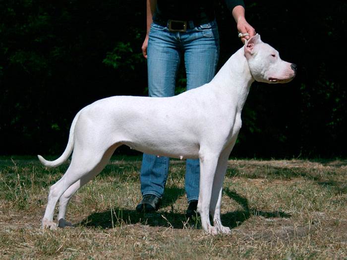 Каждая собака аргентинского дога является крупным созданием, которое имеет пропорциональное тело и большую голову. Пес имеет короткую, гладенькую, идеально белую шерстку. Могут быть точечки черного цвета на ушках и конечностях. Животное имеет тонкий, средний хвост. Собака с висячими ушами, однако, их купируют, придавая тем самым форму стоячих треугольников.
